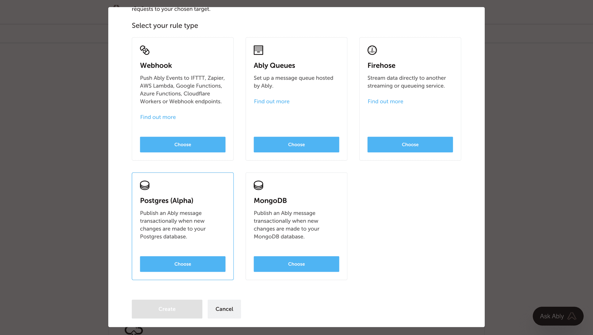 Next, click the Choose button in the Postgres (Alpha) card.